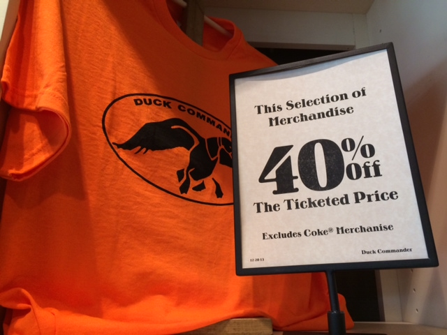 I was just a Cracker Barrel for breakfast and saw the manager put up the 40% off signs on the entire Duck Dynasty Section of merchandise. I said, “You guys too?” She said, “It wasn’t my decision!” I’m calling for all Americans who believe in free speech and our Judeo/Christian foundation to stand up and be counted. Be counted by the way you vote. Be counted by what places you spend your money. Be counted by without being obnoxious, not being afraid to speak up and counter the insanity that is modern-day America!